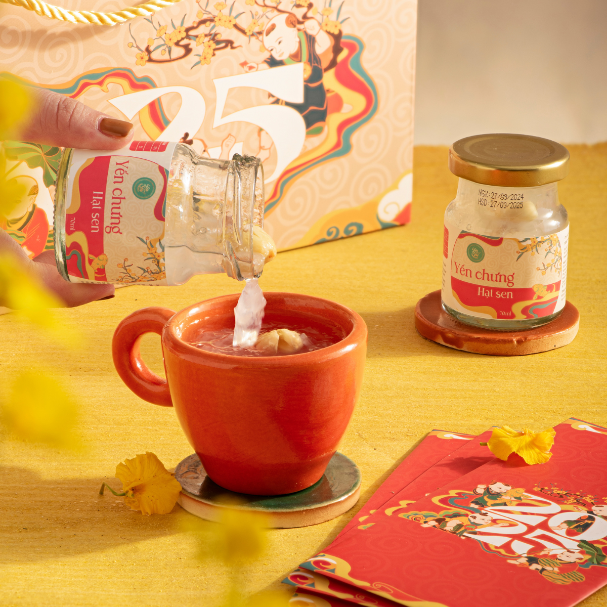 Thành Phần: Tổ yến khô (750 mg), nước tinh khiết, hạt sen (1800 mg), đường Isomatl (6000 mg), chất ổn định (INS 418)