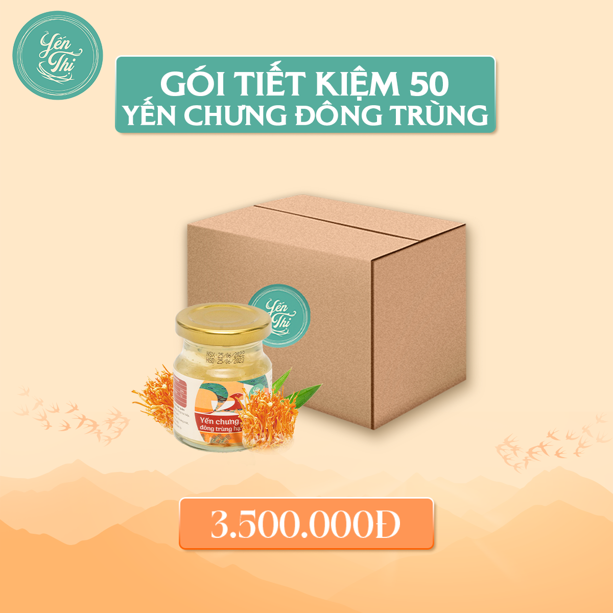 Thành phần: Nước tinh khiết, Yến sào (750 mg), Đông Trùng (1g), đường phèn, nước cốt lá dứa, chất ổn định (INS 418)