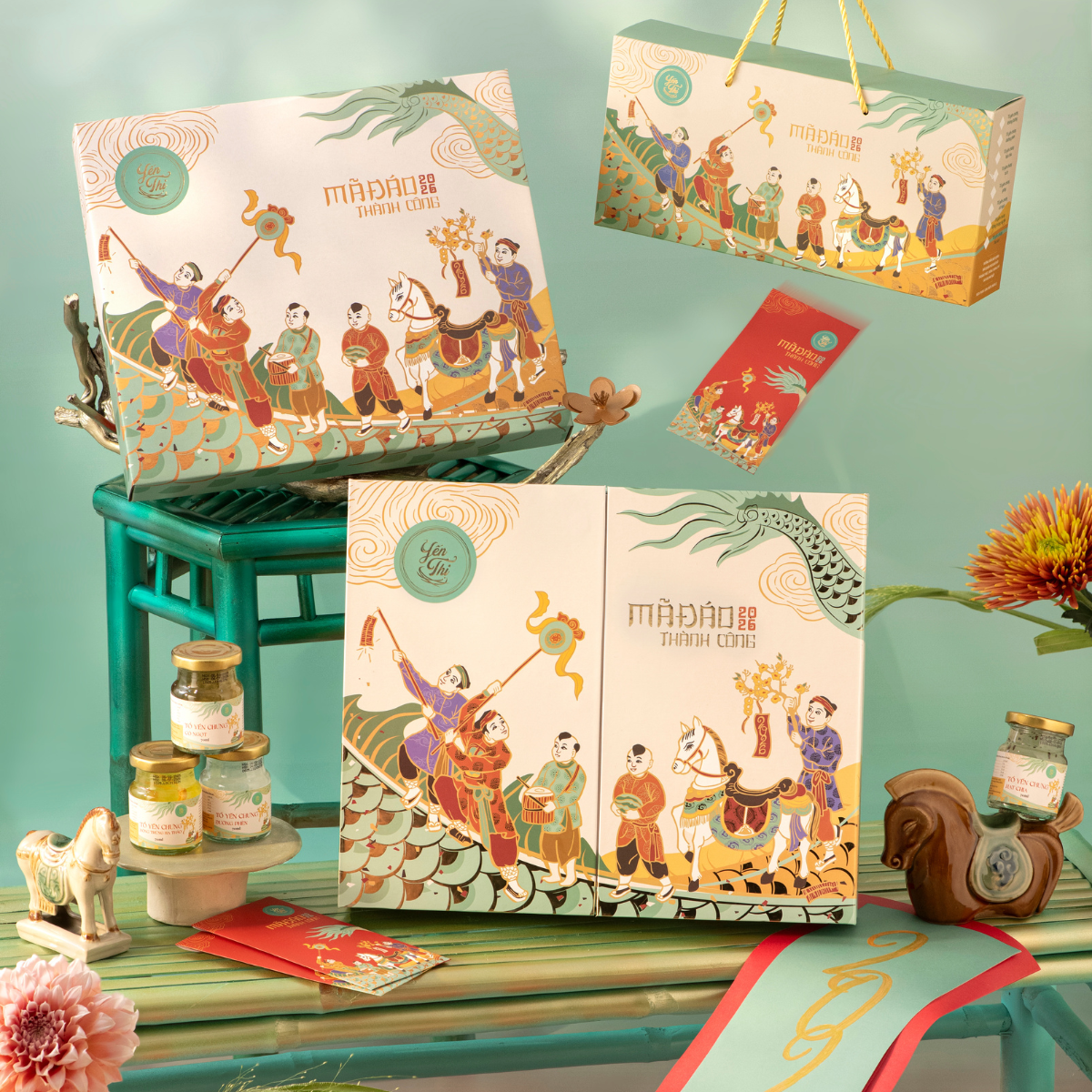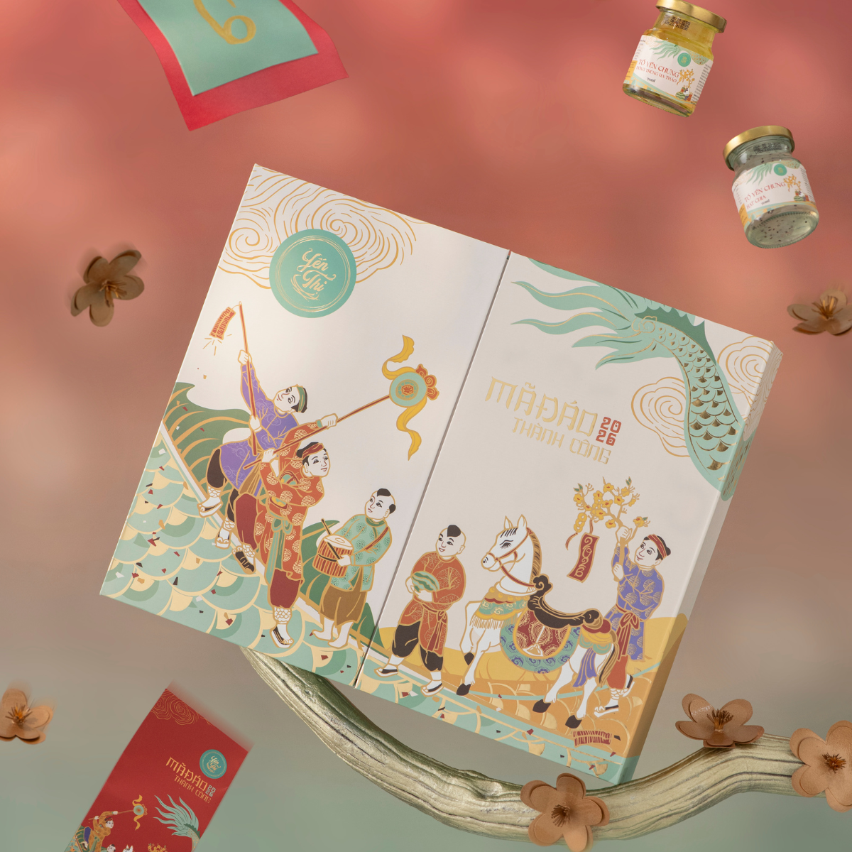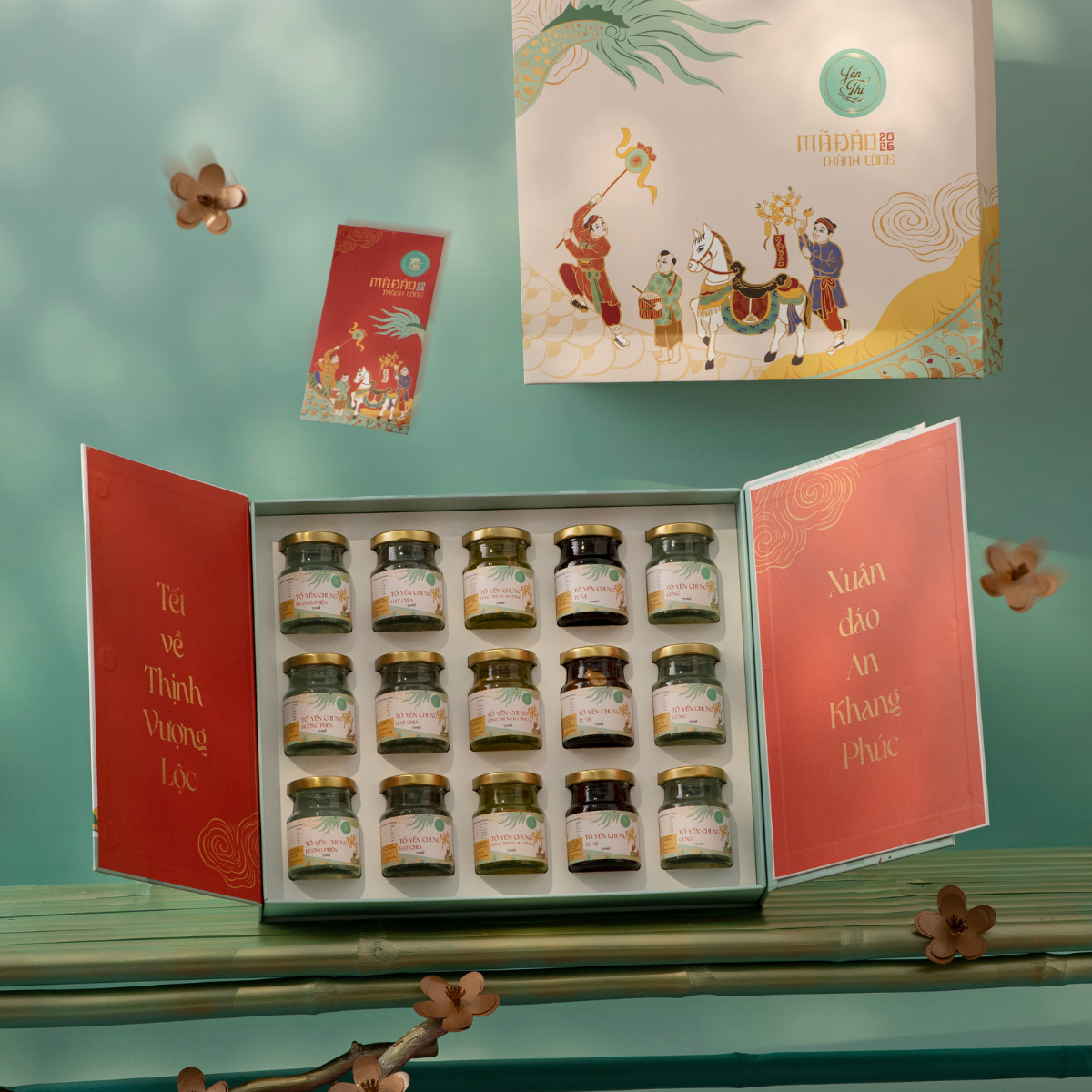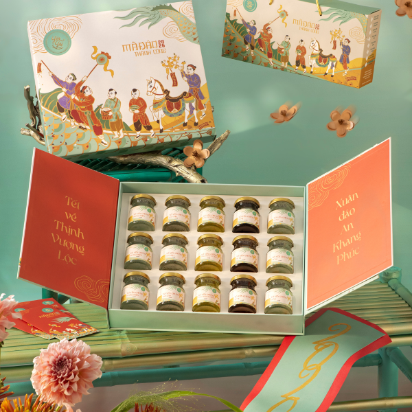 Hộp sử dụng chất liệu giấy mỹ thuật cao cấp kèm túi giấy bên ngoài.